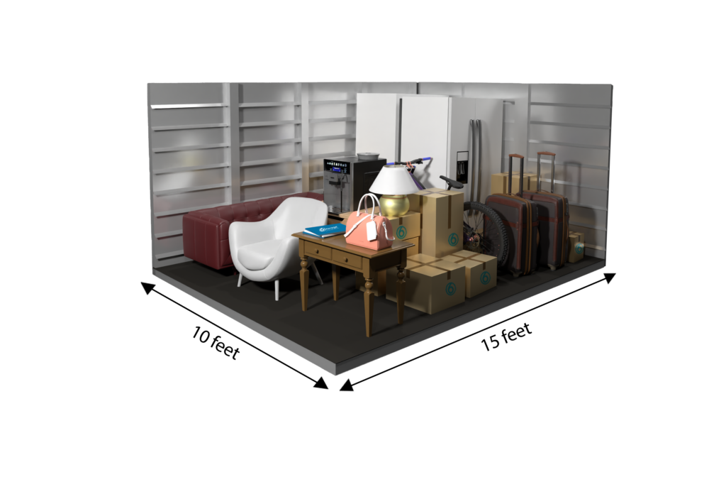 Our 10×15 unit can hold the contents of an average two-bedroom apartment, including larger items such as a piano, couches, tables, or large-screen TVs, along with several medium- to large-sized boxes.